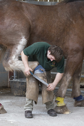 Thanks to Janey M for sharing this photo of a farrier at the Colebrook Shire Horse Center in Cheshire, England. The photo was taken last week and she insists the farrier was not a small man. Sorry the farrier is not identified but he had a big, big job to do there!
